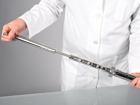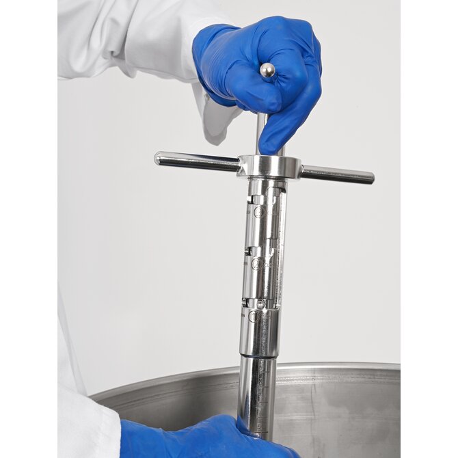Numune mızrağının daldırma derinliği, lazerle kazınmış derinlik ölçeğinden kolayca okunabilir. Yuvarlatılmış uç kabın çizilmesini önler. İki ek tutamak, malzemeye güvenli bir şekilde yerleştirme, sabitleme ve döndürme sağlar. Tam olarak oturan uçlar malzemelerin karışmasını önler ve kapsamlı temizlik için kolayca sökülmesini sağlar.