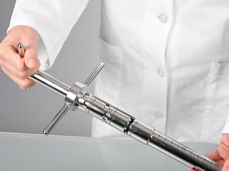 Lazerle oyulmuş derinlik ölçeği sayesinde numune mızrağının daldırma derinliği kolayca okunabilir. Yuvarlatılmış uç, kabın çizilmesini önler. İki ek tutamak, malzemenin güvenli bir şekilde yerleştirilmesini, sabitlenmesini ve döndürülmesini sağlar. Tam olarak oturan uçlar malzemenin karışmasını önler ve kapsamlı temizlik için kolayca sökülmesini sağlar.