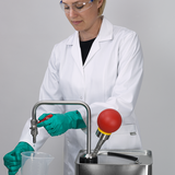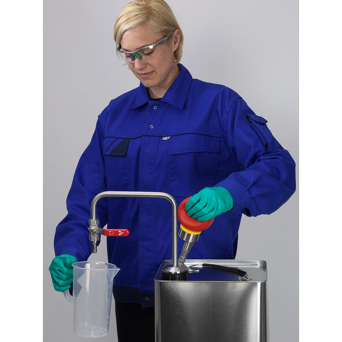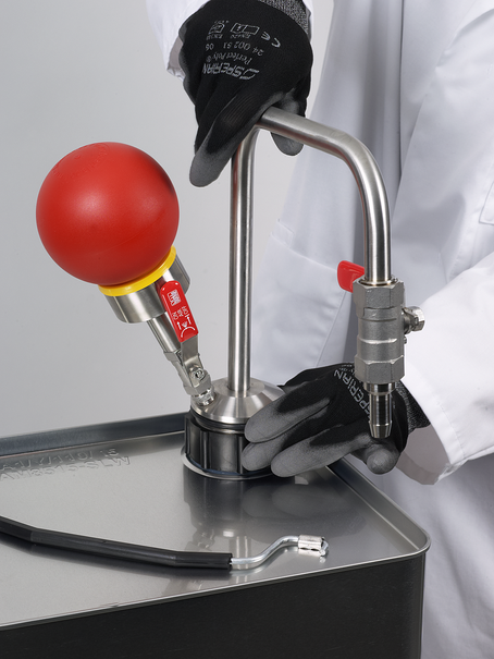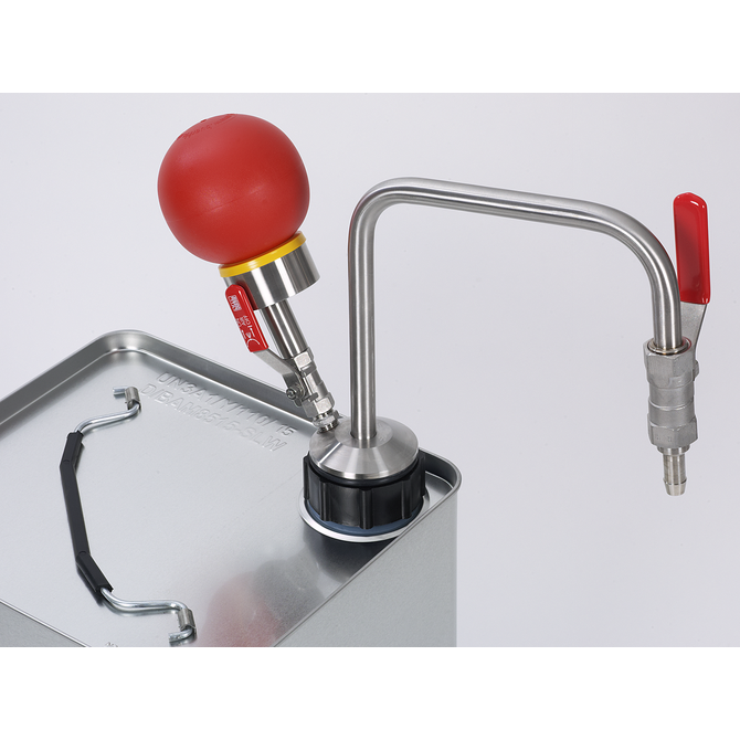 Organik solventlerin ve aroma maddelerinin kontaminasyon olmadan uzaklaştırılması için elle çalıştırılan solvent pompası. El pompası aşırı basınç prensibine göre çalışır. Pompa bilyesi ile tankta aşırı bir basınç oluşur ve sıvıyı kabın dışına iter.