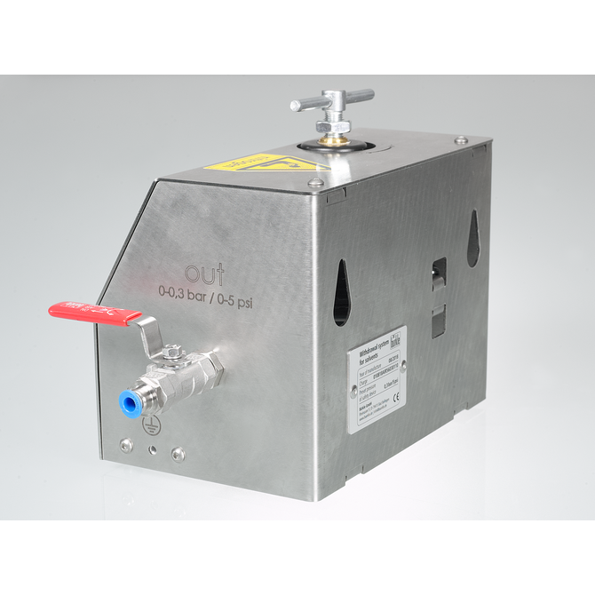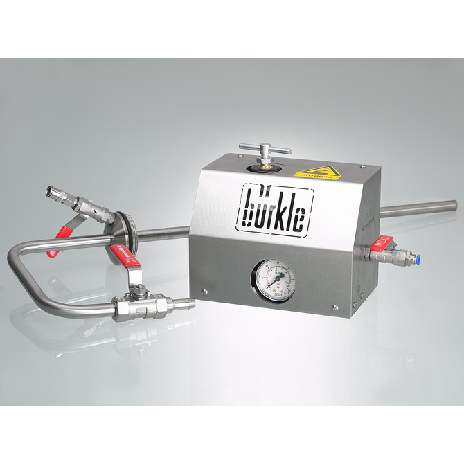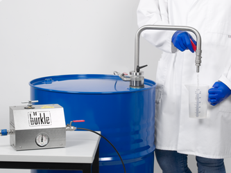 灌装非常简单:使用加压气体(压缩空气或氮气)在容器中产生超压,迫使液体从容器中流出。使用加压气体的好处是,用户可以轻松取出大量溶剂,并腾出双手重新填充溶剂。这意味着,即使是丙酮、乙醇、甲醇等危险介质,也可以通过排放龙头进行安全填充和精确计量。对于氧敏感或高纯度介质,可使用惰性气体(如氮气)。